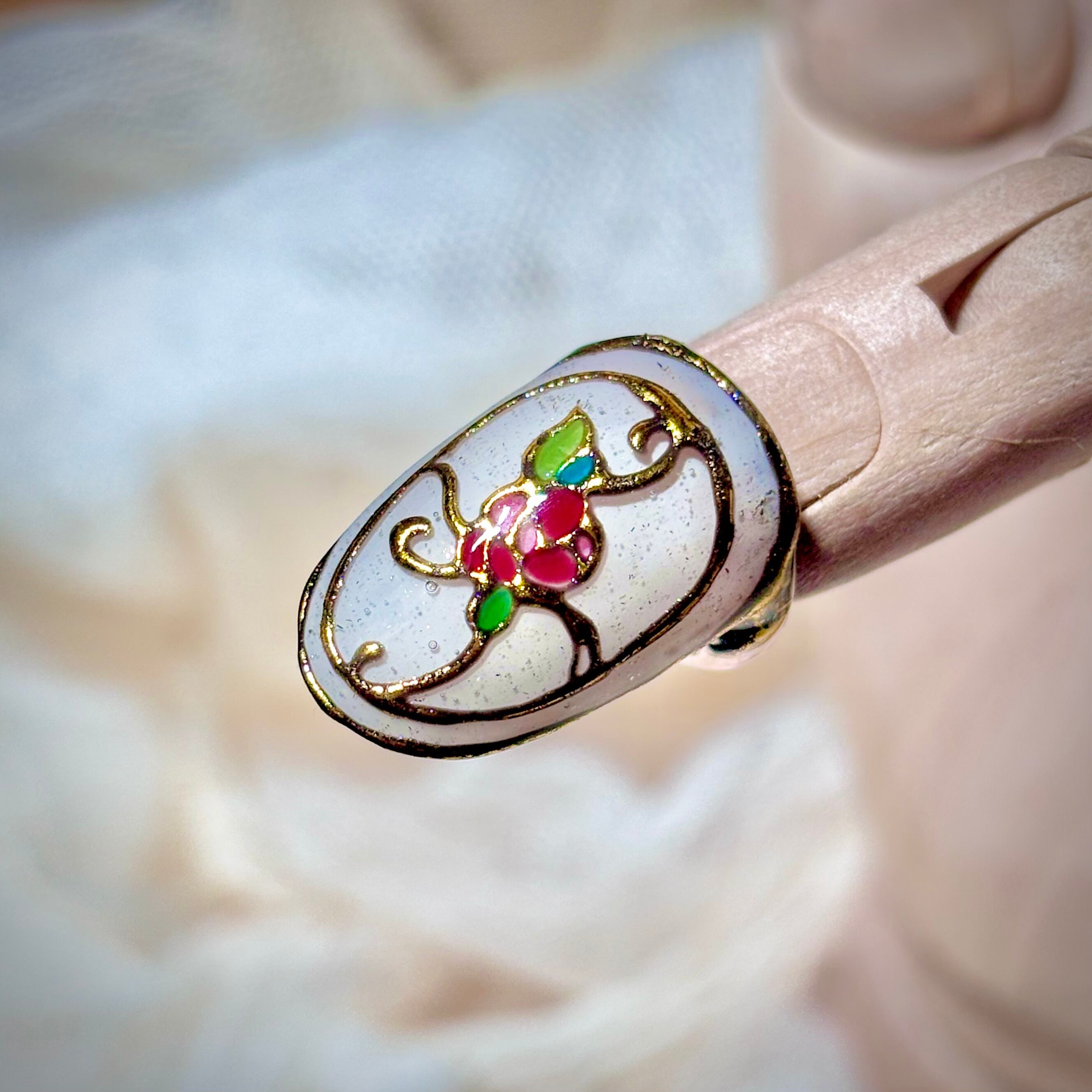 ステンドグラスのようなデザインのネイルリングです。