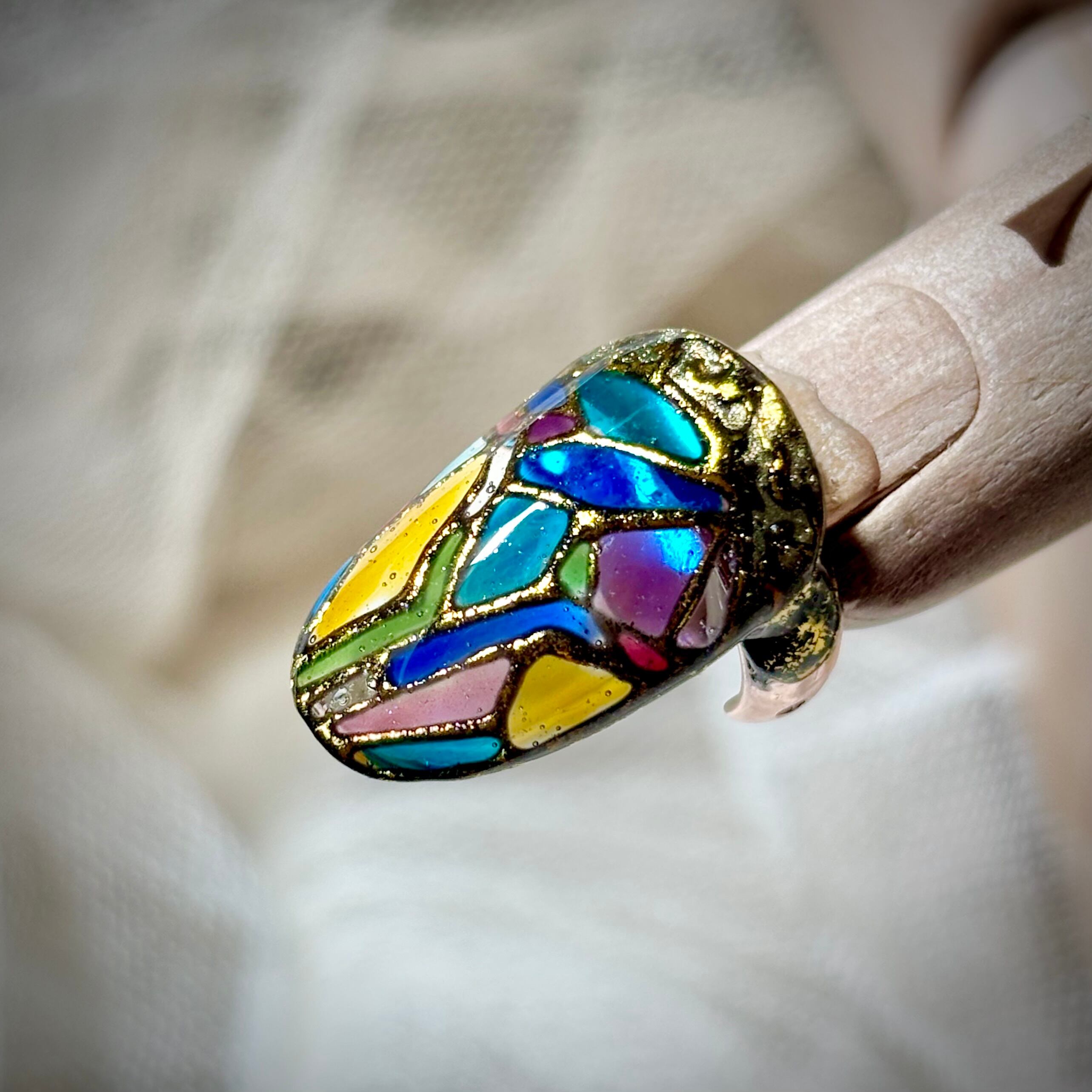 ステンドグラスのようなデザインのネイルリングです。